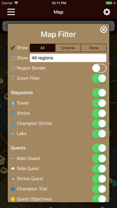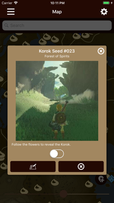 A short description of each Shrine, Side Quest, Shrine Quest and Korok Seed is included. Shrines, Side Quests, Shrine Quests, Minibosses, Treasures and Korok Seeds can also be tracked with a check list. You can check or uncheck your checklist entries even from the icon shown on the map.